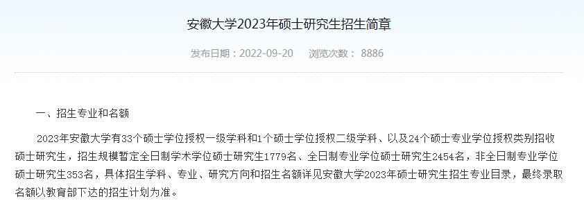 大皖新闻讯 9月20日,安徽大学2023年硕士研究生招生简章公布。